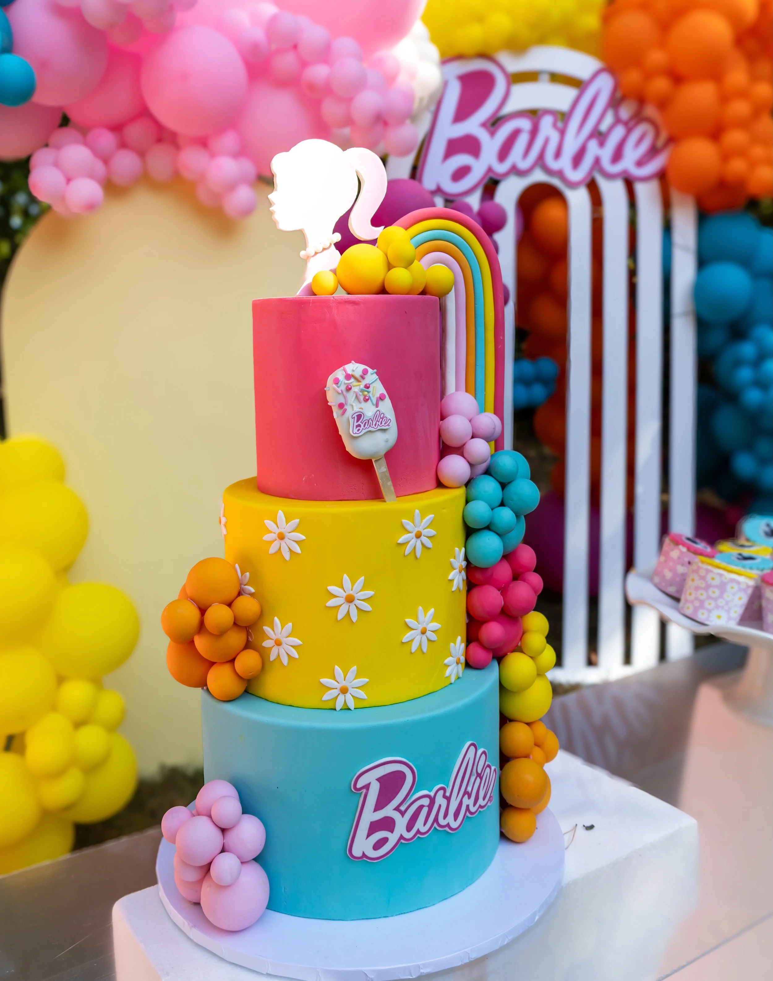 The cake was a three-tiered masterpiece inspired by the iconic Barbie aesthetic. The base layer was coated in a soft blue fondant featuring a bold pink Barbie logo, while the middle tier burst in sunny yellow with delicate white daisies. The top tier featured a bright pink tone, adorned with a Barbie silhouette cake topper and colorful candy bubble clusters. A rainbow fondant arc and cake pop added playful dimension, tying the entire piece together.